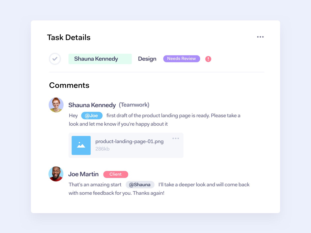 Build stakeholder and client alignment into your project planning from day one. With Teamwork.com, you can communicate directly with stakeholders around important parts of your project plan, @mention them for input or approval, and give them greater visibility over the planning and implementation of the project.